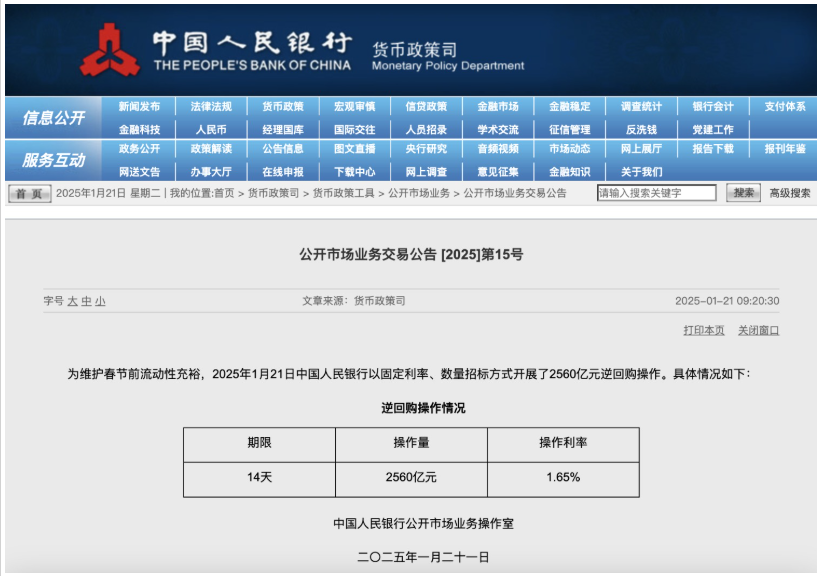 央行公开市场今日进行2560亿元14天期逆回购操作